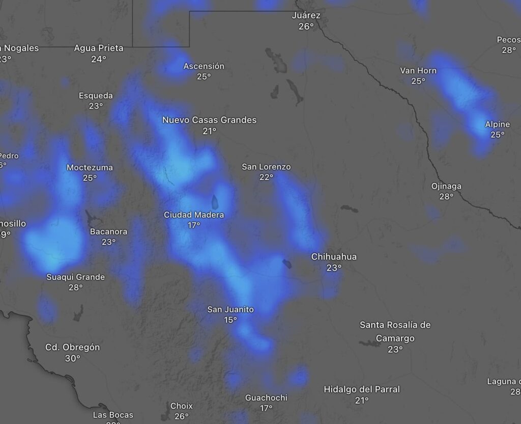 Las fuertes precipitaciones iniciarán este lunes en unos 10 municipios, aunque el mayor volumen se visualiza en Nuevo Casas Grandes, Madera, Buenaventura y Ascención, de acuerdo a mapas desplegados por la página del clima Windy.
