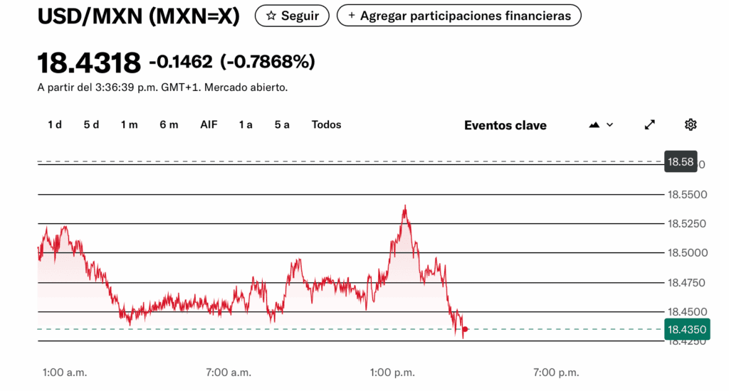 Desde las 8 horas de este lunes, el peso iniciaba un periodo de ajustes a las bajas para ubicarse en los 18.43 a las 9:00 horas, aunque a las 13:28 horas (tiempo de Londres) había alcanzado picos hasta de 18.54, 3 centavos más abajo que su precio de cierre del viernes.