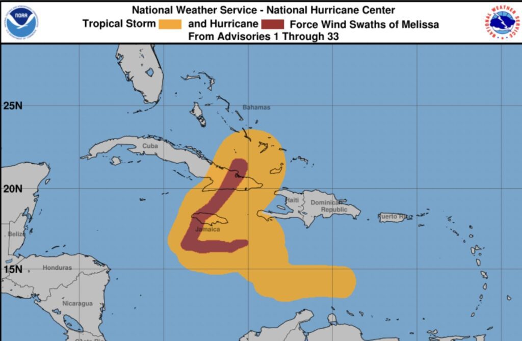 Esta mañana, Melissa pasó las costas de cuba y se localiza a unos 245 kilómetros al sur de Las Bahamas Centrales con vientos sostenidos de unos 155 kilómetros por hora y con ujn movimiento de 12 kilómetros por hora.